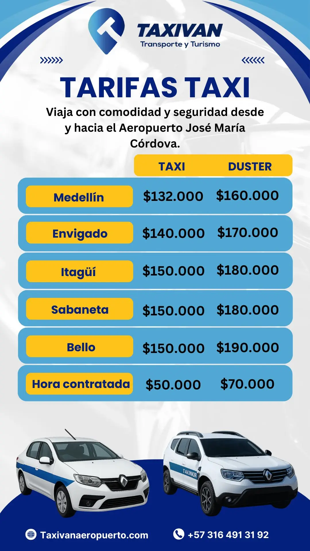 La tarifa de taxi expreso desde el Aeropuerto Jose Maria Cordova hacia Medellin es de 132.000$