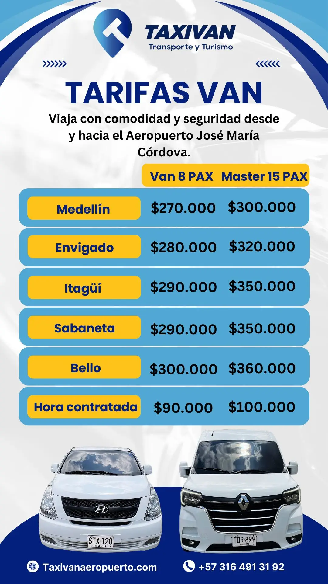 | Aeropuerto JMC (Medellín) | La Ceja | $110.000 | $140.000 | $220.000 | $280.000 | $340.000 | |||